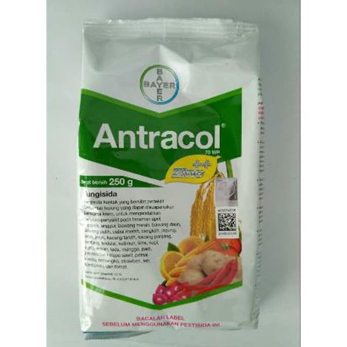 Ready stock kak,,,silahkan order !!!! keburu habisss...Antracol 70 WP adalah fungisida kontak berbentuk tepung berwarna krem yang dapat digunakan untuk mengendalikan berbagai jenis penyakit pada tanaman yang disebabkan oleh jamur/cendawan. Antracol 70 WP merupakan salah satu produk unggulan dari perusahaan pestisida PT. Bayer Indonesia yang telah lama dikenal oleh masyarakat luas. Fungisida yang bekerja secara kontak ini memiliki sifat protektif dan cepat dalam mengendalikan penyakit jamur. Antracol 70 WP diproduksi dalam sediaan tepung dan berbahan aktif propinep 70%, dapat dilarutkan dengan air dan disemprotkan ketanaman. Fungisida Antracol 70WP bisa digunakan pada berbagai jenis tanaman, baik tanaman sayuran daun, sayuran buah, maupun tanaman buah dan tanaman perkebunan. Antracol 70WP dapat digunakan untuk mengendalikan penyakit jamur pada tanaman cabai, tomat, semangka, melon, timun, pare, gambas, apel, anggrek, anggur, bawang merah, bawang putih, bawang daun, cengkeh, jagung, jeruk, jarak, kacang tanah, kacang panjang, buncis, kentang, kedelai, kopi, kubis/kol, lada, mangga, bibit kelapa sawit, teh, strawberry, dan tanaman lainnyaSpesifikasi Antracol 70WPMerk dagang:Antracol 70WPJenis :FungisidaBahan aktif:Propinep 70%Formulasi:WP (Wattable Powder)Warna :Krem/putih kekuninganBentuk fisik:TepungProdusen:PT. Bayer IndonesiaKemasan : 250grKelebihan Fungisida Antracol 70WP1. Fungisida bekerja secara kontak langsung, yaitu fungisida akan langsung bekerja ketika larutan yang disemprotkan bersentuhan dengan tanaman yang terinfeksi.2. Antracol 70WP berbentuk tepung dapat disuspensikan dengan air dan larut dengan segera, sehingga penggunaannya lebih mudah dan praktis.3. Dapat digunakan pada segala musim, baik musim kemarau maupun musim hujan.4. Dapat digunakan untuk mengendalikan penyakit jamur pada banyak jenis tanaman.5. Fungisida Antracol 70WP bersifat racun kontak dan tidak dapat menembus jaringan tanaman, sehingga residu lebih re