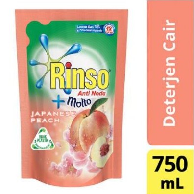 RINSO Molto Japanese Peach Liquid 750mlDari sekian banyak pilihan deterjen yang dimiliki oleh Rinso, akhirnya ada inovasi baru yang kembali dihadirkan. Rinso Japanese Peach Liquid diciptakan sebagai bentuk rinso cair yang ampuh untuk menghilangkan noda. Rinso cair yang baru ini sudah menggunakan teknologi canggih yaitu SmartForm, yang mana setiap busa yang dihasilkan akan lebih cepat hilang sehingga dengan begitu akan mempercepat proses membilas pakaian. Dan yang terpenting Rinso telah memformulasikan produk ini dengan keharuman wangi yang menyegarkan.Detail:- Rinso Cair- Dipadukan dengan molto- Volume 750m