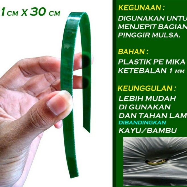 bahan : Plastik PE mikaketebalan : 1 mmpanjang : 30 cmlebar : 1 cmisi : +100 batangKeunggulan- lebih mudah di tekuk dan di tancapkan ke tanah,- lebih tahan lama dari pada kayu/bambu- bisa digumakan lebih dar