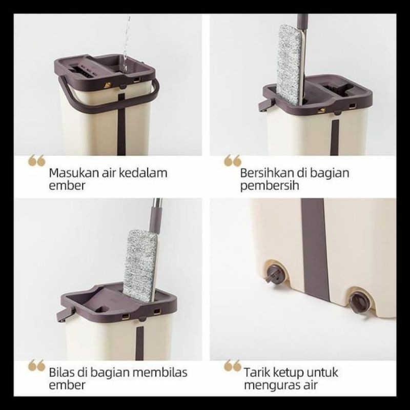 Didesign khusus untuk menghemat tenaga, cukup celupkan 3 kali kain pel langsung kering. Menggunakan kain berkualitas tinggi yang mudah untuk dibersihkan serta daya serap yang dapat dipakai untuk membersihkan noda basah maupun noda kering.Kegunaan :1. Mempunyai bucket dengan 2 sekat terpisah (DRY & WASH)2. Dapat membersihkan secara menyeluruh termasuk area yang sulit dijangkau.3. Kain pel berbahan serat mikro yang dapat menyerap sempurna.4. Bisa digunakan untuk membersihkan noda kering dan basah5. Terdapat lubang pembuangan airHarap Ikuti cara pemasangan kainnya dengan baik dan benar, agar kain bisa masuk ke dalam ember.Cara Pemasangan :1. Masukan kedalam 3 kaitan yang tersedia,2. Keratkan pada seluruh permukaan,3. Pastikan semua permukaan sudah menempel4. Masukan air kedalam ember,5. Bersihkan di bagian pembersih,6. Bilasdi bagian membilas,7. Lepaskan tutup pembuangan air untuk menguras airDeskripsi Produk :* 1buah kain pel ukuran 33cmx12cm* 1 set tongkat pel ukuran 125cm* 1 buah ember ukuran 23cmx23cm