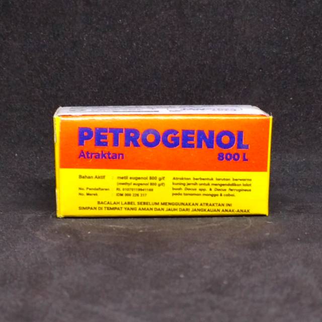 Petrogenol adalah atraktan dengan bahan aktif metil eugenol 800 g/l yang berfungsi menarik lalat buah jantan masuk ke dalam perangkap. Dengan begitu jumlah dan perkembangan lalat buah akan berkurang.Memasang Perangkap Menggunakan Petrogenol1. Atraktan Petrogenol 800 L dipaparkan pada medium kapas. 2. Mampatkan kapas dengan dipilin sampai sebesar ibu jari kemudian diikat dengan kawat kecil. 3. Teteskan Petrogenol 800 L sebanyak 0,125 - 0,25 ml (pada kapas sampai basah namun tidak menetes).4. Pasang pilinan kapas yang sudah diberi Petrogenol 800 L di dalam tabung oerangkap sedemikian rupa sehingga menggantung pada bagian tengah tabung perangkap.5. Gantungkan perangkap pada dahan atau ranting setinggi 2 - 3 meter dari tanah atau di bagian dalam tajuk pohon.Dosis Penggunaan- Pemasangan perangkap dikerjakan sejak pembentukan buah sampai panen.- Pemberian Petrogenol 800 L pada kapas dikerjakan setiap 4 minggu sekali.- Dalam 1 ha (hektar) per tanaman mangga dapat dipasang 25 titik penempatan dengan jarak antar masing-masing perangkap 20 m
